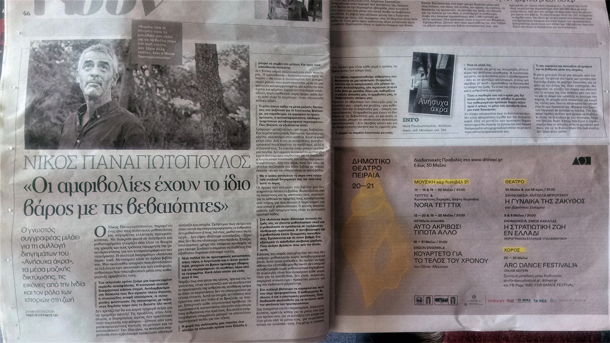 Нікос: Я думаю, що природа мистецтва, отже, література, полягає у виявленні та виділенні безпрецедентного в людському існуванні, навіть коли обставини не диктують цього з такою інтенсивністю. Зараз, скажімо, новини з Індії чи Бразилії виходять за рамки будь-яких літературних намірів. Безпрецедентні ситуації частіше ведуть людей до своїх меж. І ця невизначена територія може бути привілейованим полем для мистецтва.